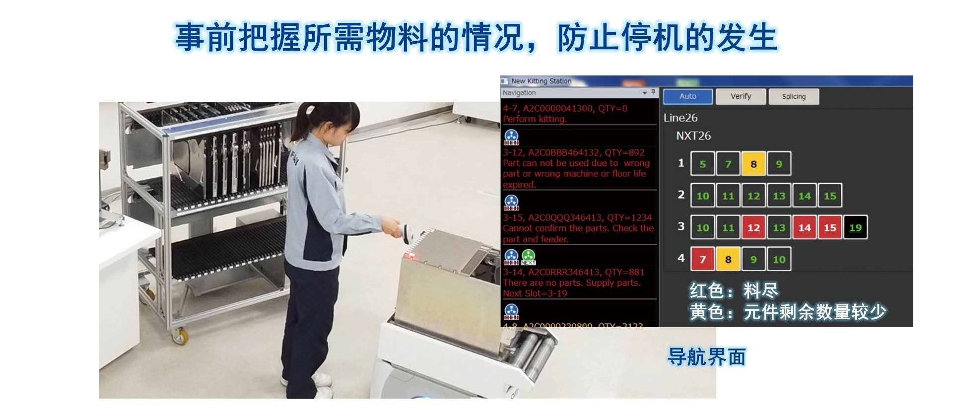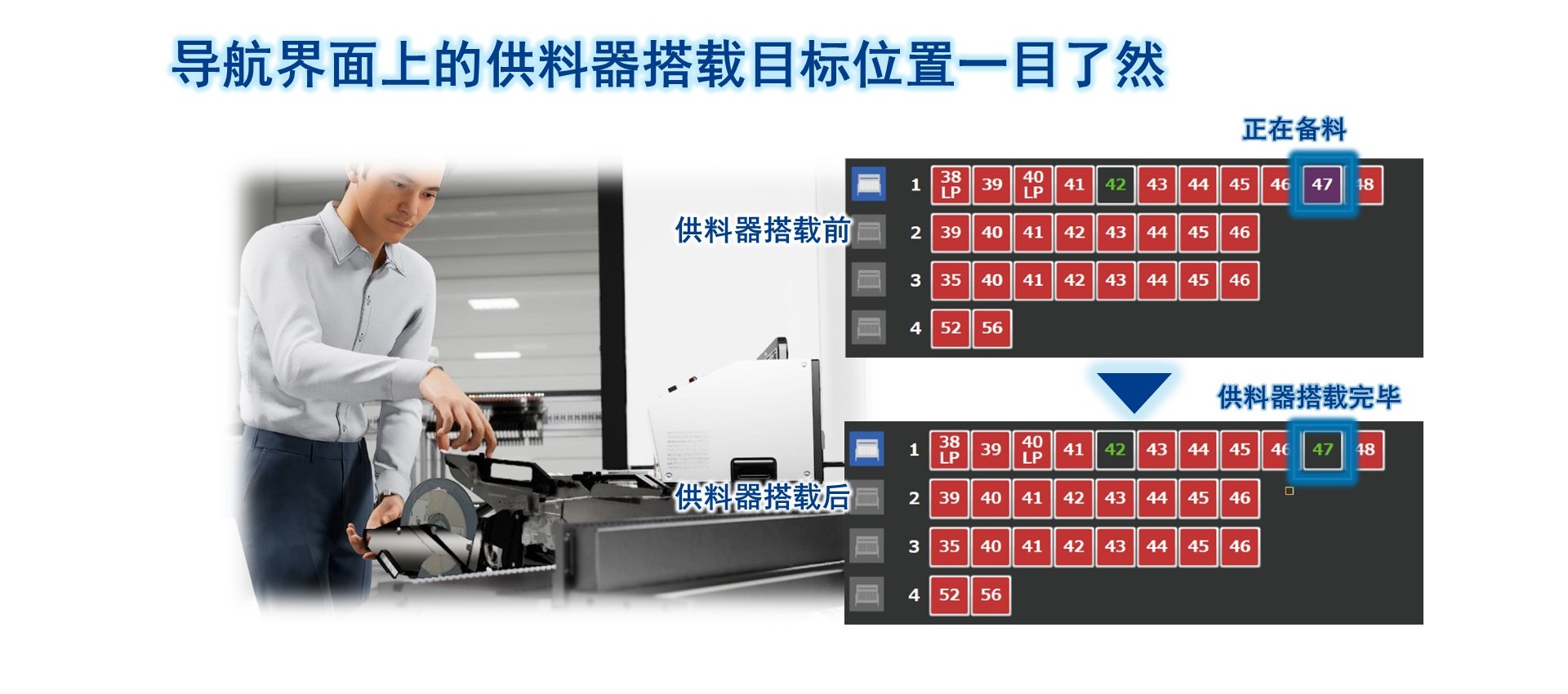 由于导航界面上的供料器搭载目标位置一目了然,因此操作员可以毫不犹豫地去做换线工作。