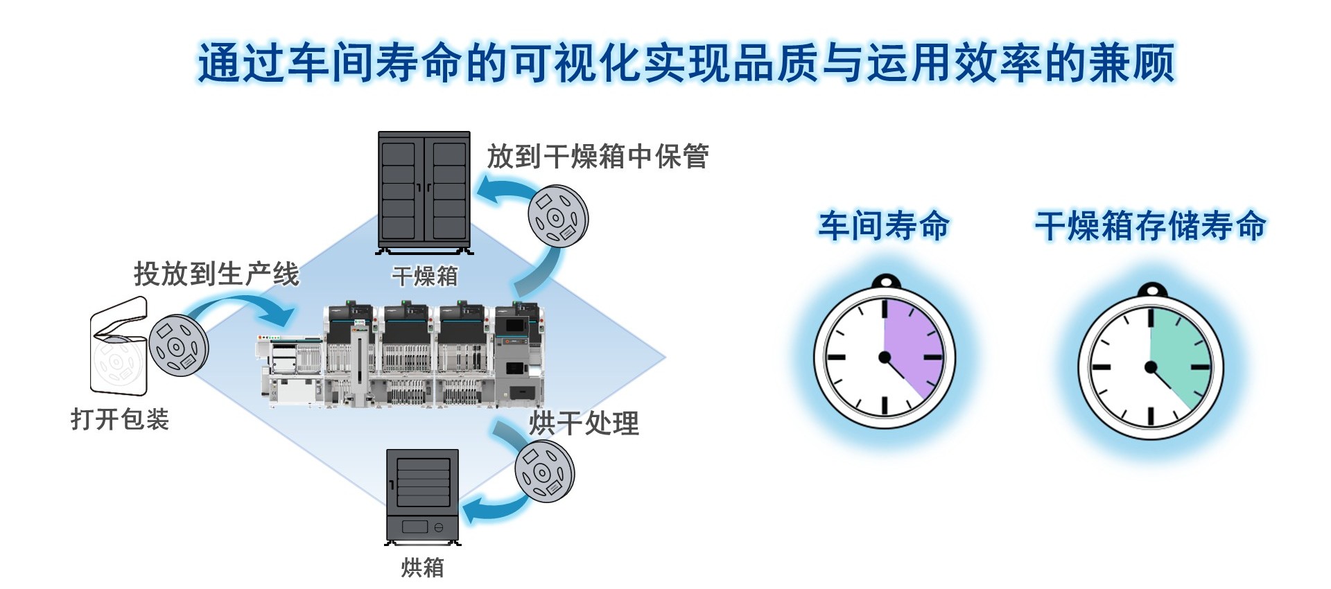 根据工作自动测算车间寿命,以防止品质出现劣化。还对表示物料在干燥箱内的保管状态的干燥箱存储寿命进行测算,使得生产现场能够根据物料的状态进行合理的运用。