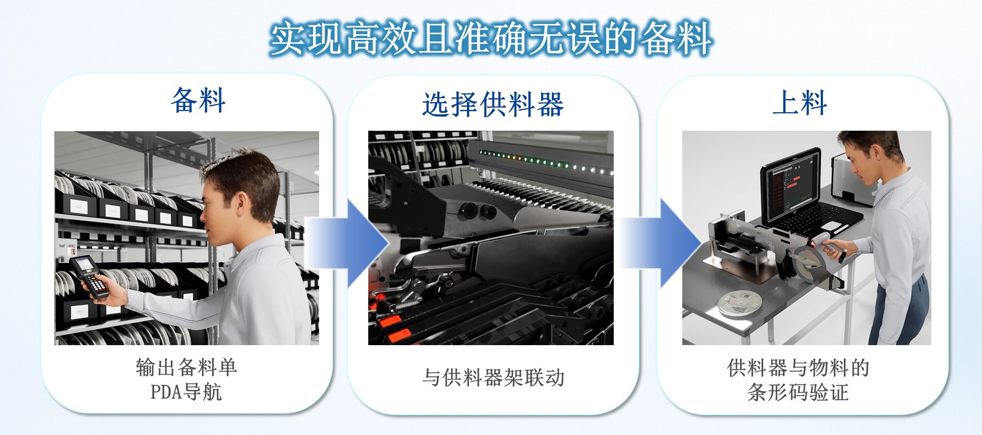 这就是在做生产准备时备料的流程。首先根据PDA导航指示收集物料,然后通过条形码验证进行确认,最后将物料安装到指定位置。实现高效且准确无误的备料。