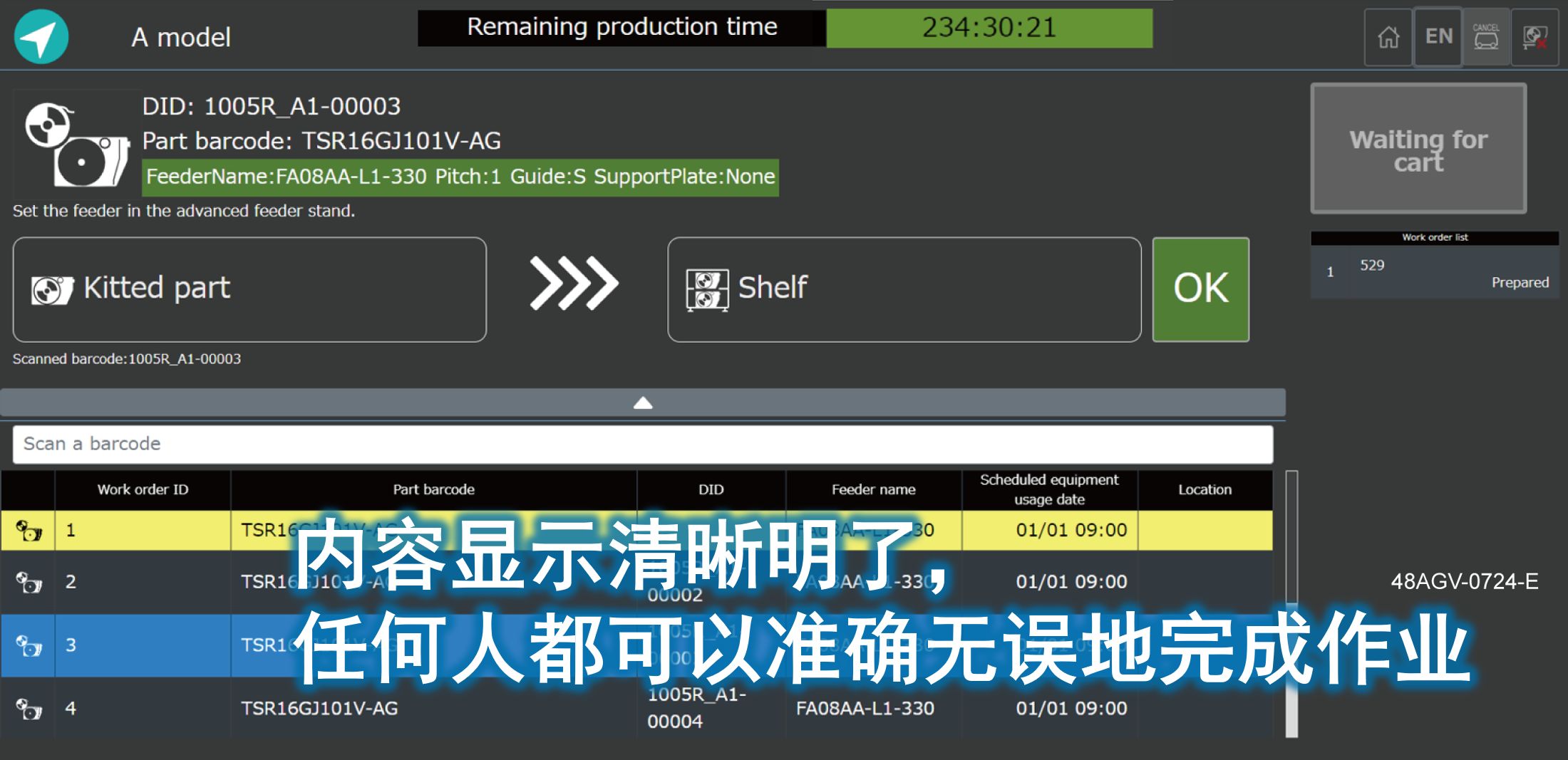拣料时,只需读取备料单上的二维码即可开始作业。系统会按照储架从近到远的顺序依次下达作业指示,由此可提高作业效率。纸质指示与数字化指示自然衔接,使物料准备作业流程变得更加顺畅。
