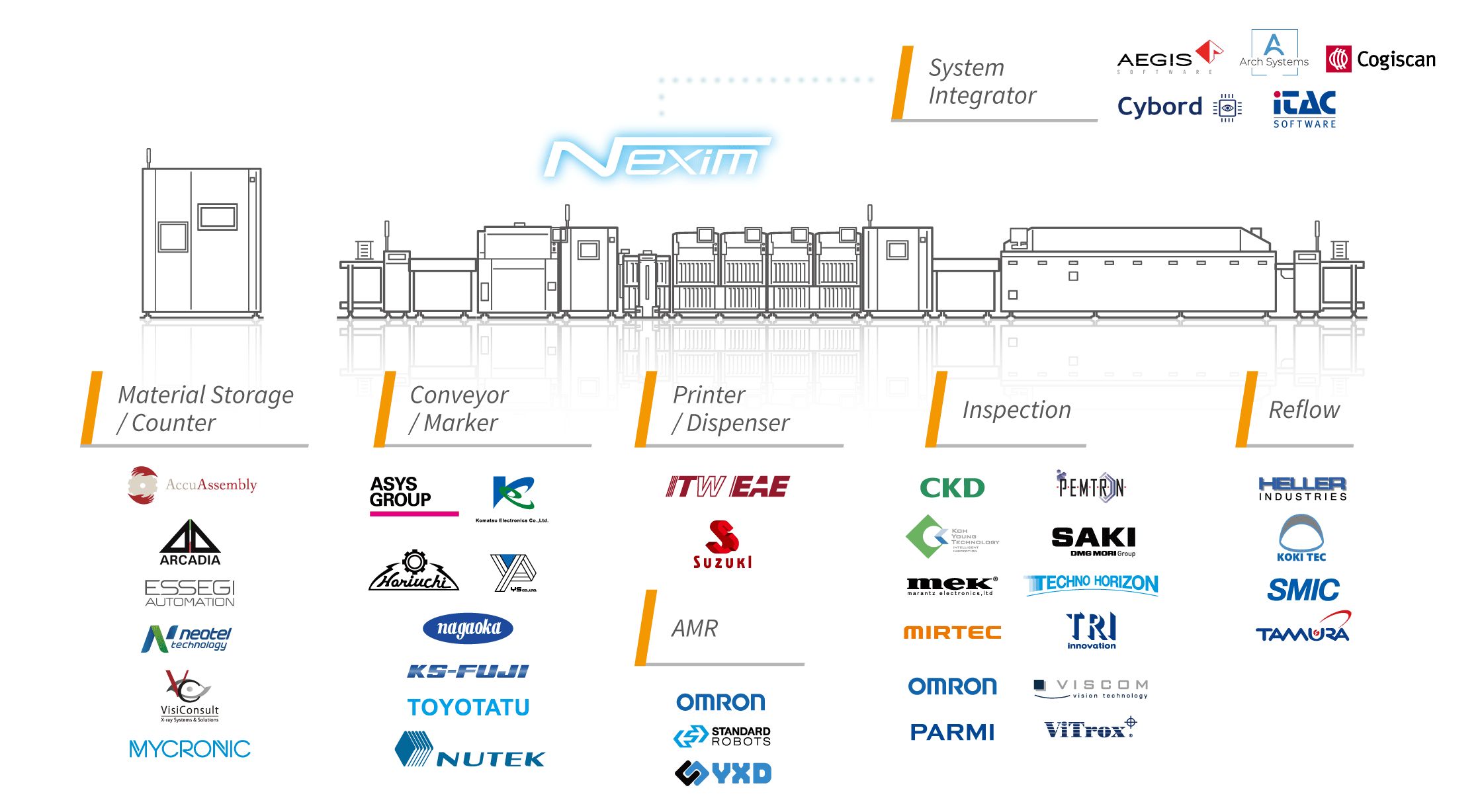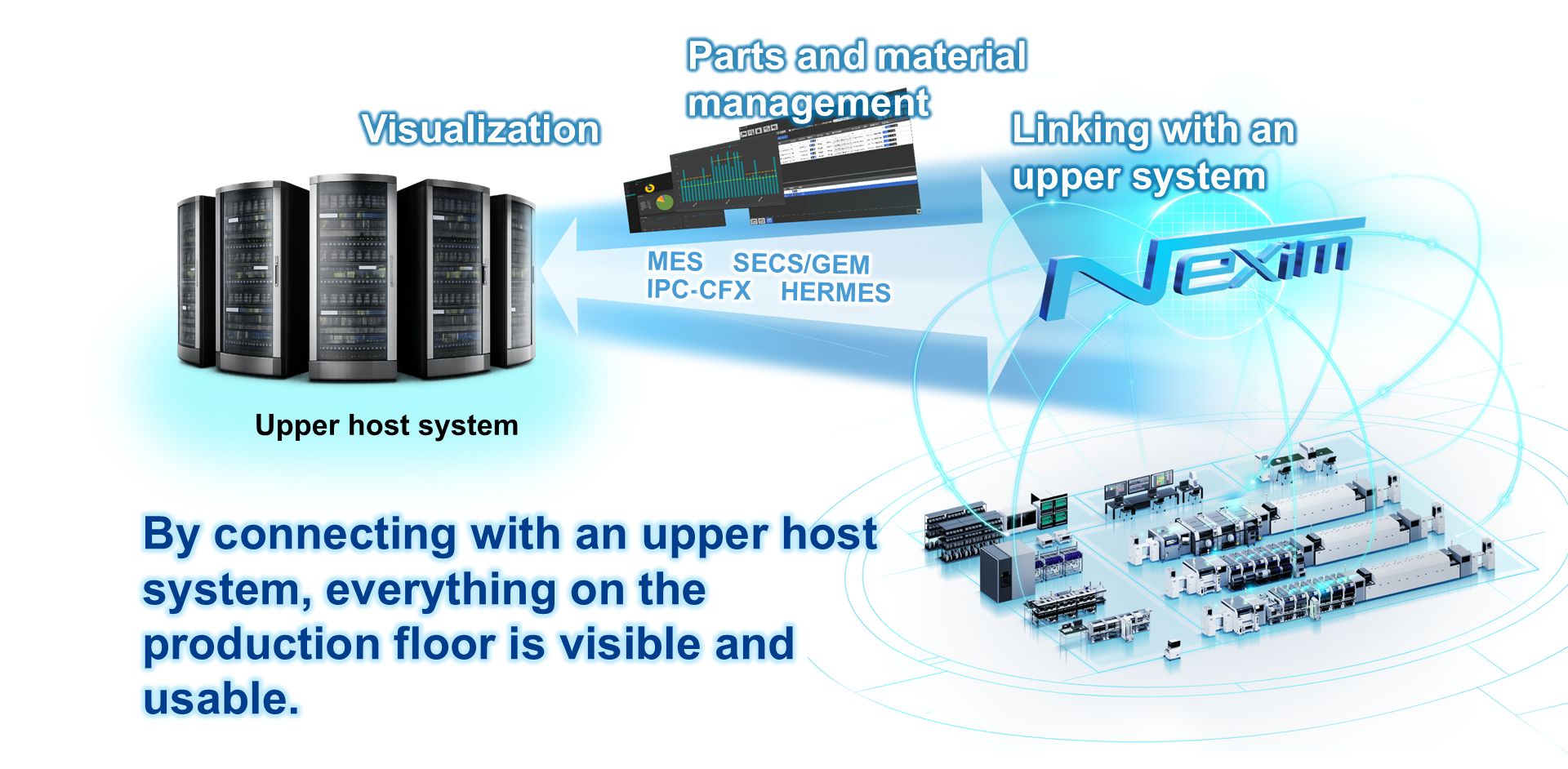 Nexim is designed to be easily connected to upper host systems. It is compatible with industry standard interfaces such as MES, IPC-CFX, SECS/GEM, and Hermes, and can be easily integrated into existing system configurations. This allows users to not only visualize but also link with the entire production floor.