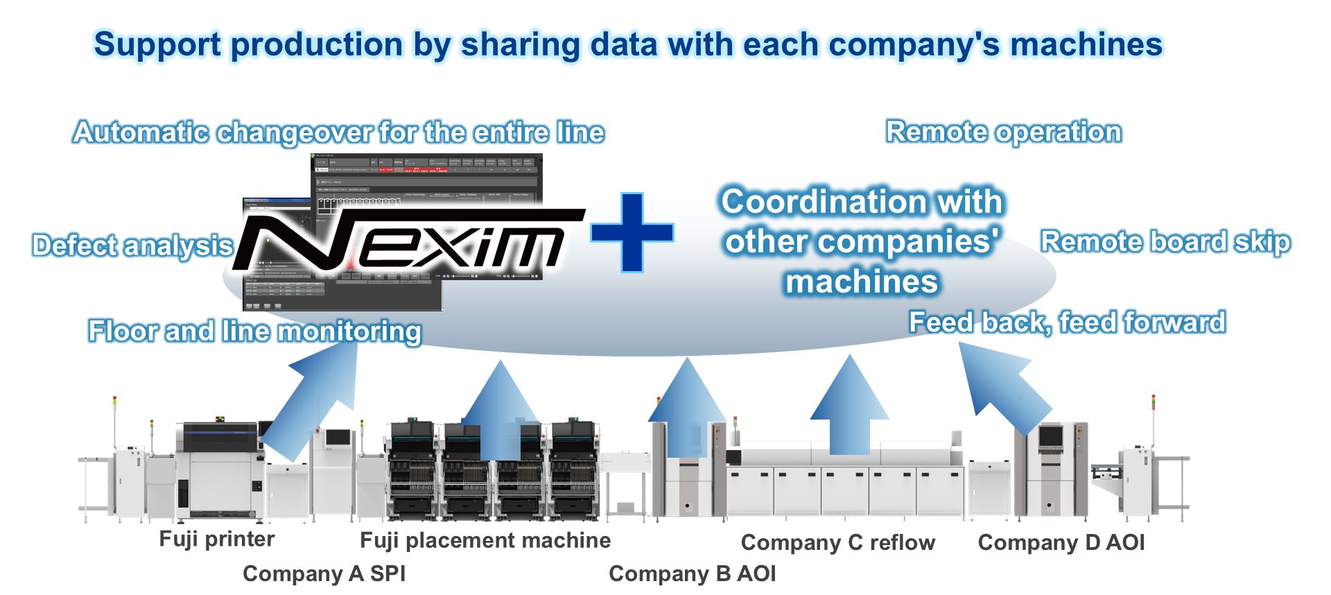 In Fuji Smart Factory line cooperation, data is shared among machines from different manufacturers, from printers to SPI, placement machines, AOI, and reflow.