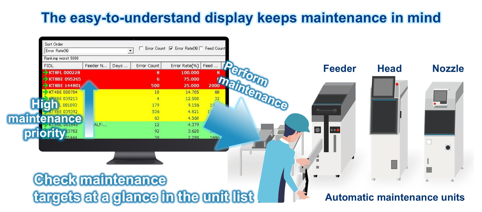 Units with high priority are automatically displayed at the top of the list, ensuring that operators can perform maintenance reliably without hesitation. It is easy to see at a glance which unit to support first.