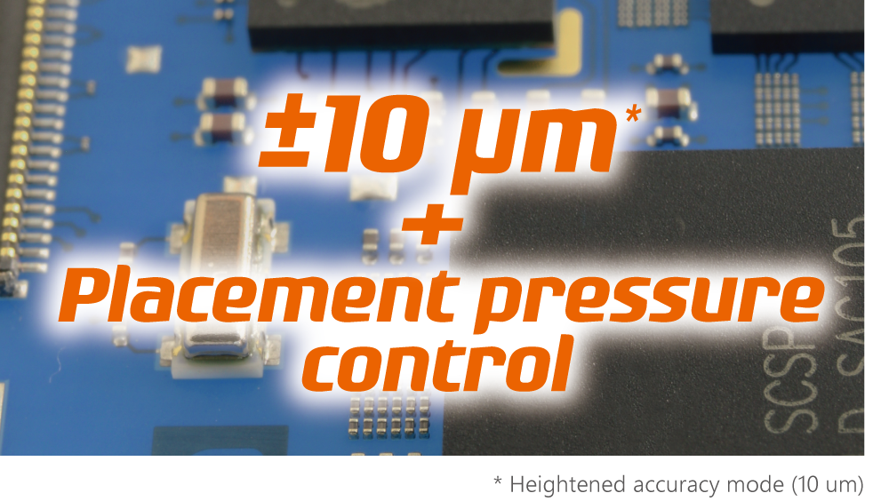 Placements can be performed with an accuracy of ±25 µm at all times without constraints for the head type or the parts to be placed. For parts requiring higher accuracy, placement with an accuracy of ±10 µm is possible by using heightened accuracy mode.