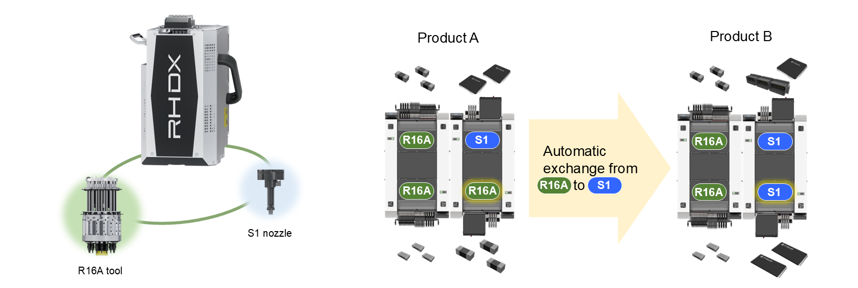 The RHDX head automatically changes nozzles and tools optimized for part size during production.