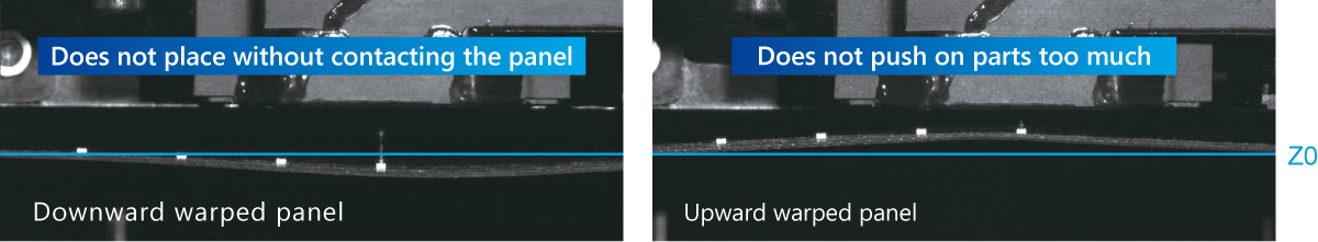 The placement stroke follows changes in the placement height due to panel warpage and distortions, which allows the machine to control the appropriate push-in amount. This moreover prevents placement deviations and excess stress on parts and panels.