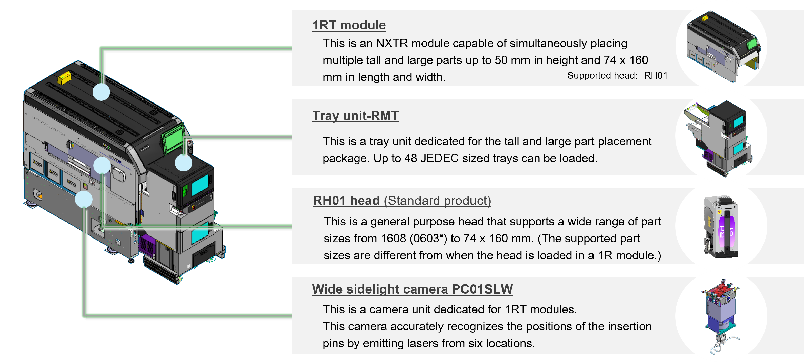 This module, in combination with a dedicated tray unit and vision processing camera, enables automatic placement of parts up to 50 mm in height.