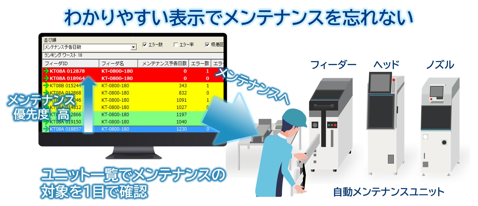 メンテナンスにおいては、使用状況やエラー傾向から最適な保全時期を通知し、安定稼働と保守作業の効率化を実現します。