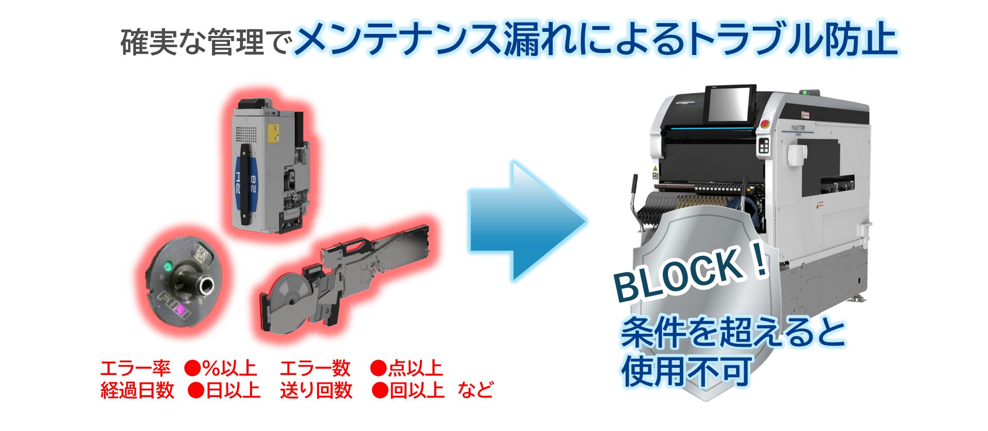 エラー率やエラー数、メンテナンスからの経過日数など 設定値を超えると、自動的に使用不可にすることができます。 設定条件を超えたまま使い続けることがないため、メンテナンス漏れによるトラブルを確実に防止します。