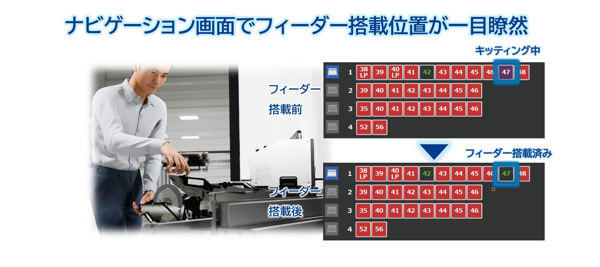 ナビゲーション画面でフィーダーの搭載位置が一目で分かるため、段取り作業が迷わずスムーズに行えます。