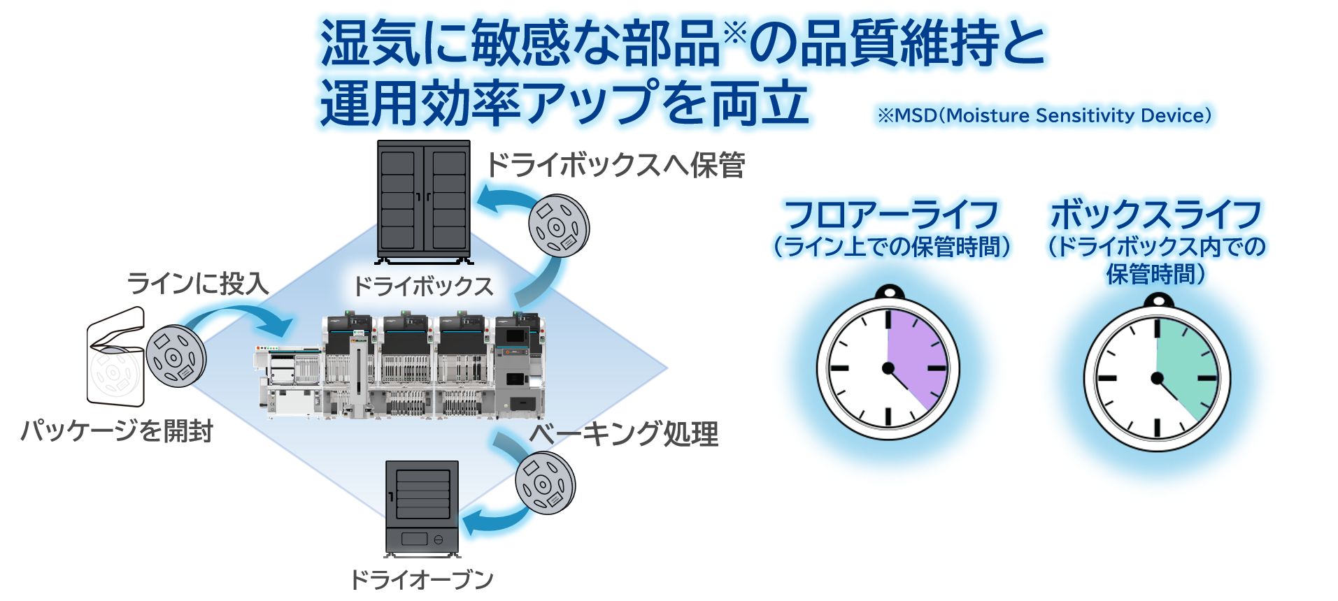 作業に合わせてフロアーライフを自動で計測し、品質劣化を未然に防ぎます。ドライボックスでの保管状態を示すボックスライフも計測され、材料の状態を踏まえた適切な運用ができます。