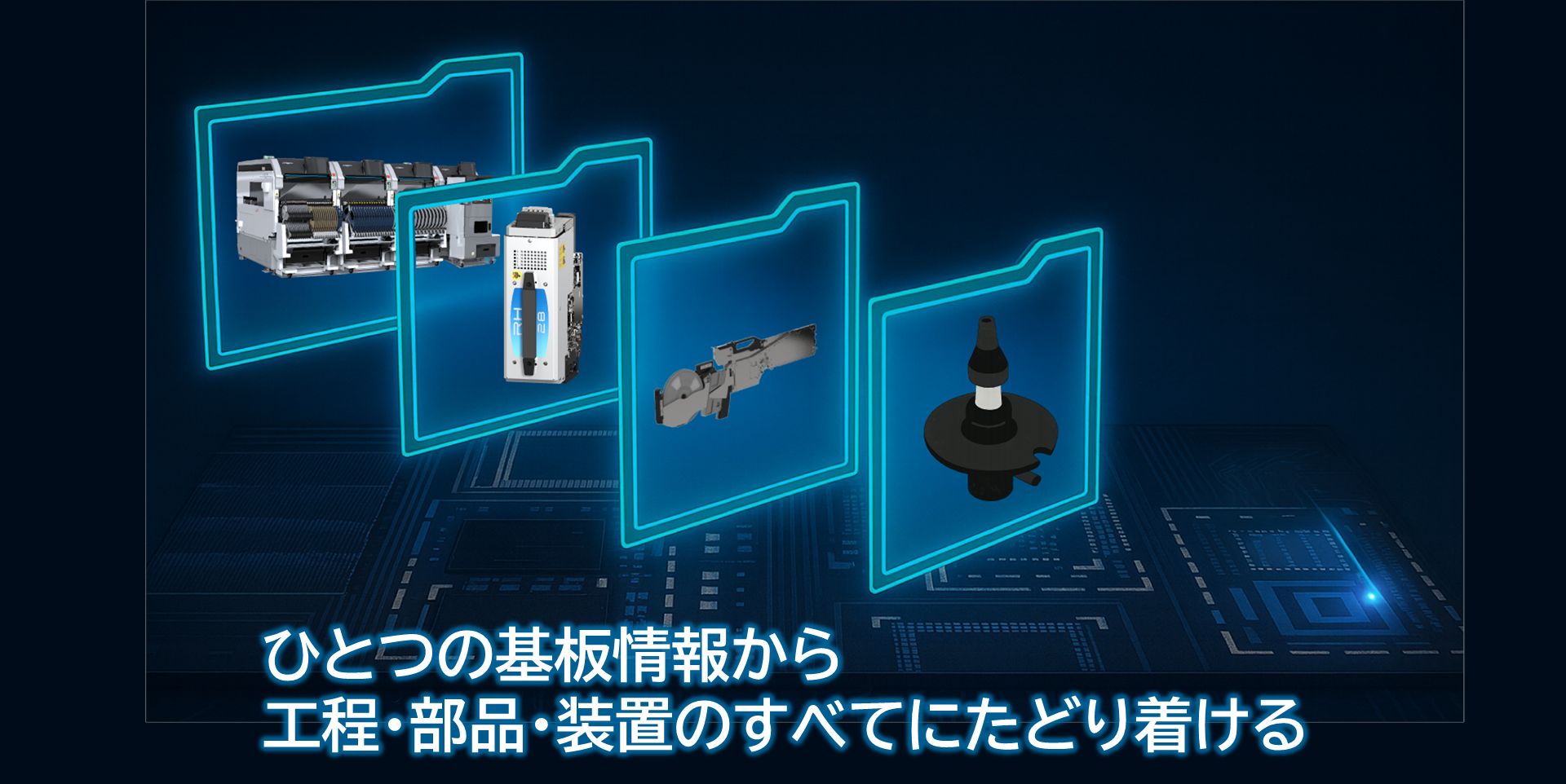 部品やロット番号、ベンダー情報、フィーダーID、オペレーター情報など、生産に関わるあらゆるデータを自動収集。さらに装置の稼働データも記録し、基板1枚から工程・部品・装置のすべてに遡ることが可能です。品質管理の強化や、不具合発生時の迅速な原因追究を支援します。