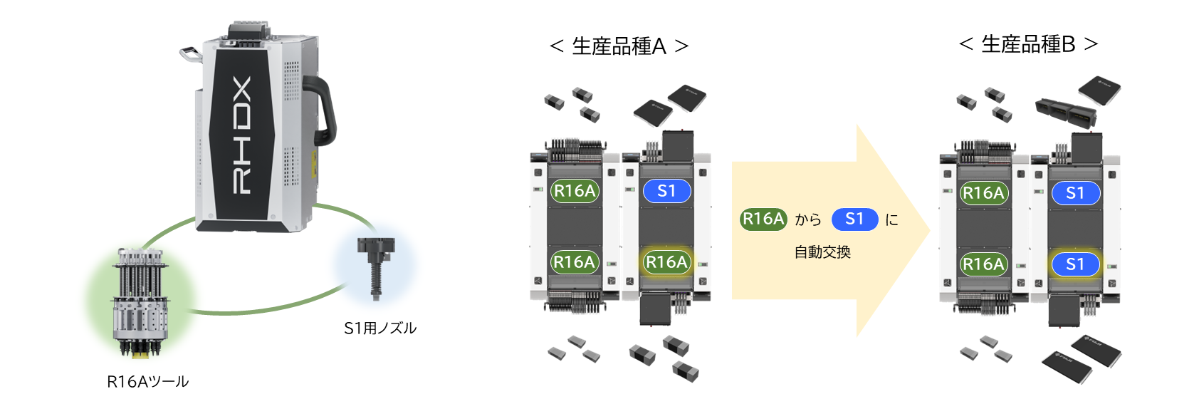 RHDXヘッドは、生産中に部品サイズに応じて最適なノズルとツールを自動で交換します。